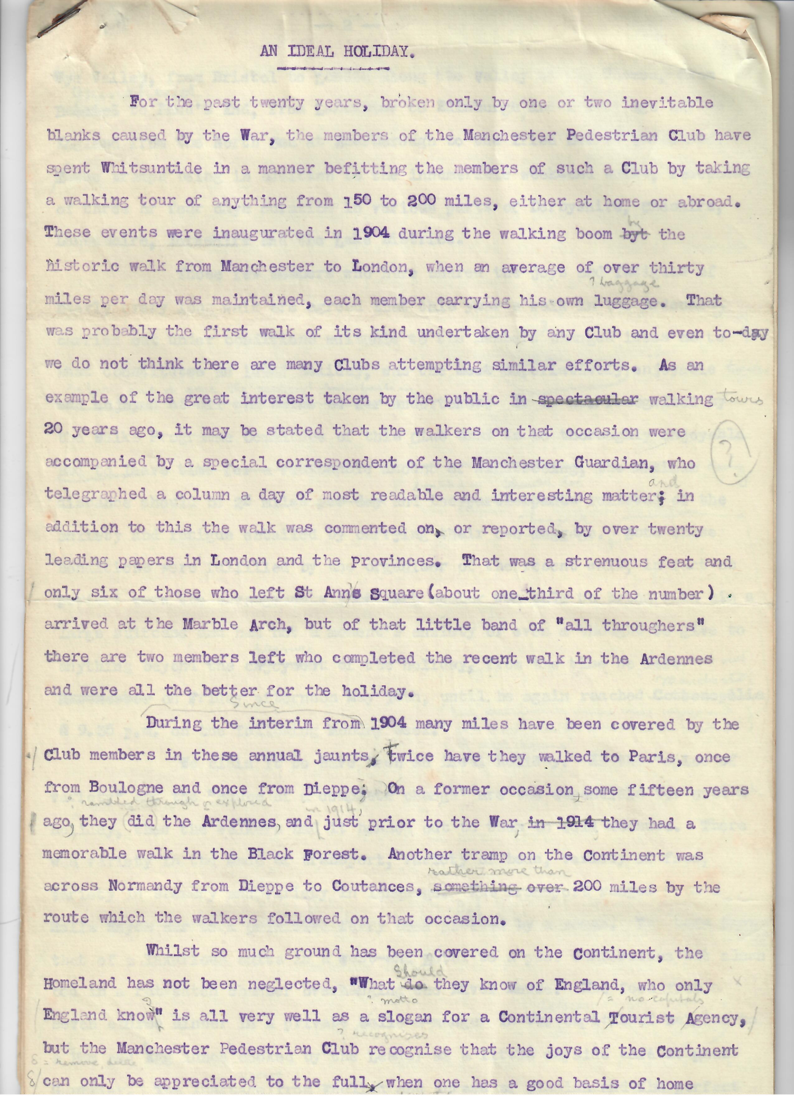 It is intended that a longer history will be written on this website. However, until then, readers might like to note that, every year, the Members' Handbook contains accounts of all the walks of the previous year, including humorous incidents or points of interest. The Members Handbooks have been deposited with Manchester Central Library.
