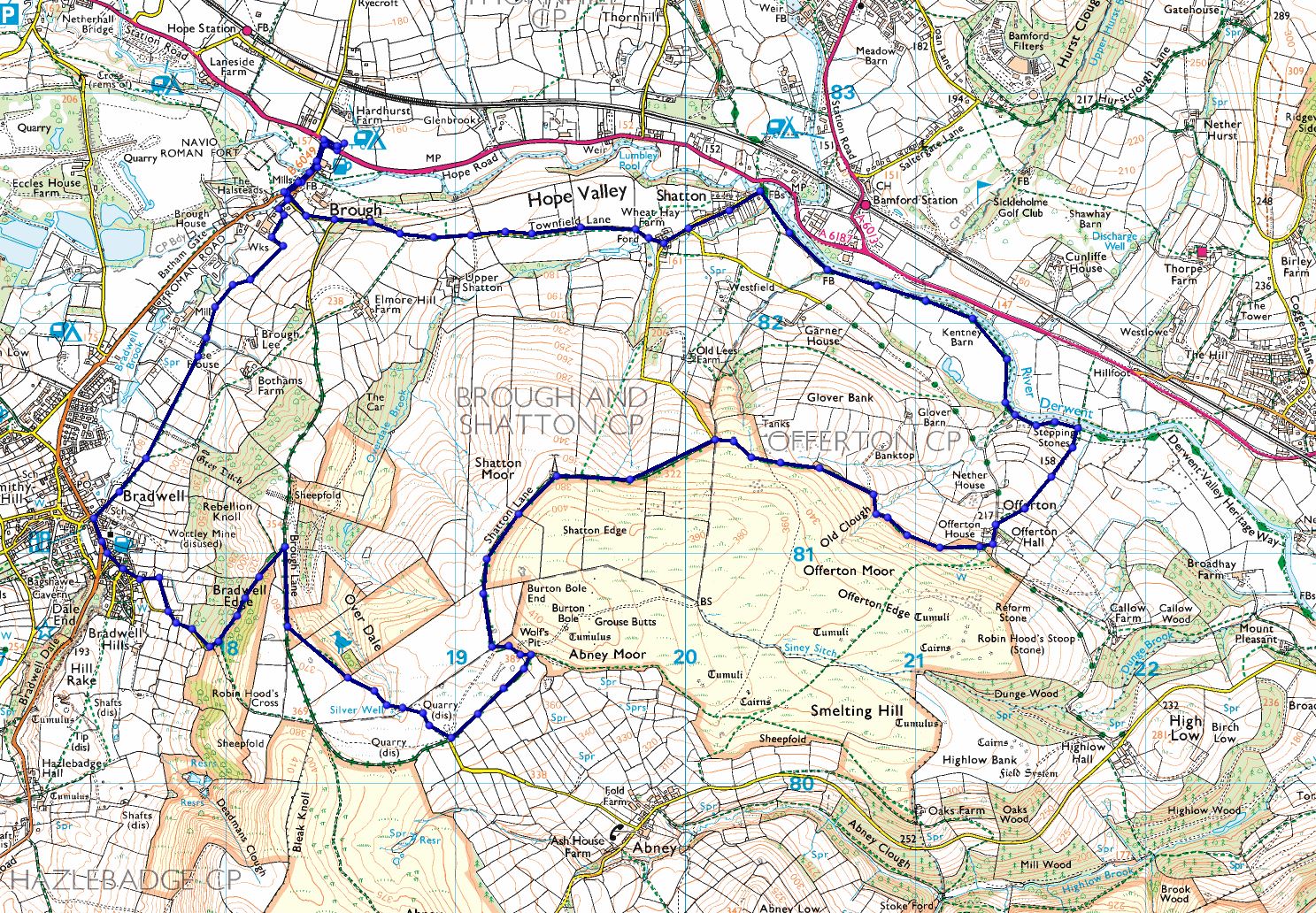 Travellers' Rest - Brough - Bradwell - up Bradwell Edge - Brough Lane - Silver Well - Abney Moor - along Shatton Lane - Offerton - down to River Derwent - along river then fields to Brough - Travellers' Rest. The walk can be shortened by leaving it from where the route leaves the moor after Offerton Hall and joins the lane, taking the lane back to Shatton and back on the original route back to the pub.